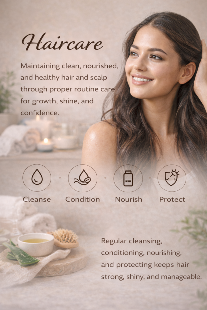 Hair care is the practice of keeping your hair and scalp clean, nourished, and healthy. A proper hair care routine helps prevent common issues such as hair fall, dryness, dandruff, and scalp irritation. Regular cleansing, conditioning, oiling, and protecting hair from heat and pollution keeps it strong, shiny, and manageable. Consistent care supports healthy hair growth and improves overall appearance and confidence.